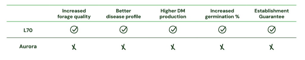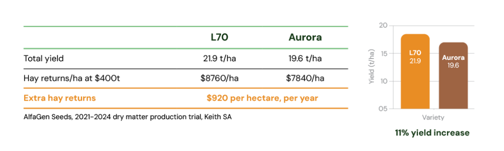 Designed specifically for Australian conditions, AlfaGen L70 lucerne has quickly established itself as a strong option for both grazing and forage production. Backed by superior plant genetics, L70 delivers consistent performance, reliable establishment and higher returns, giving producers a modern alternative to traditional winter active varieties such as Aurora.