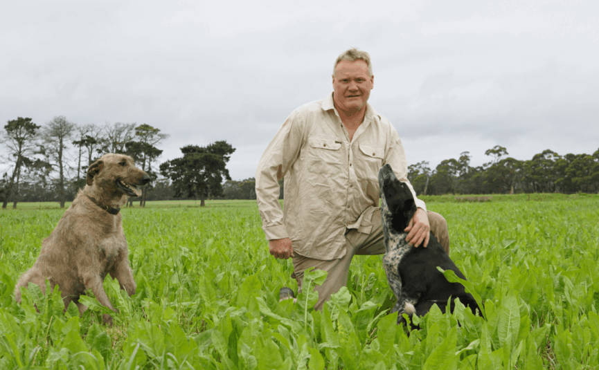 Pictured above: Graham Walker with Maggie and Ruby inspecting the regrowth on the Compass Chicory 12 days after topping