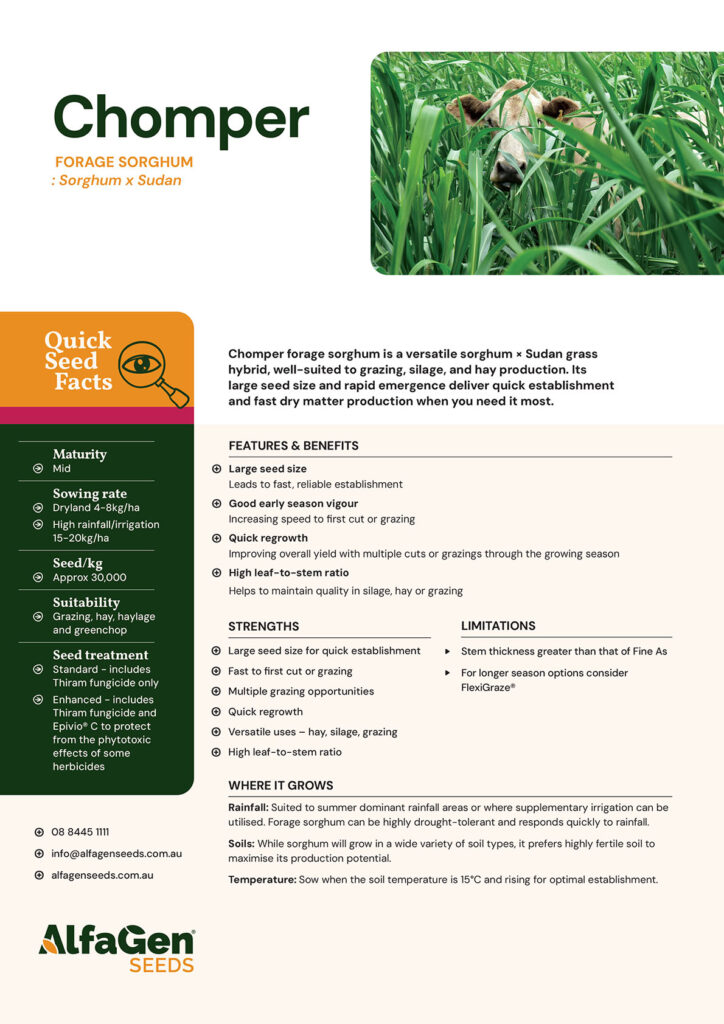 Chomper forage sorghum is a versatile sorghum × Sudan grass hybrid, well-suited to grazing, silage, and hay production. Its large seed size and rapid emergence deliver quick establishment and fast dry matter production when you need it most.
