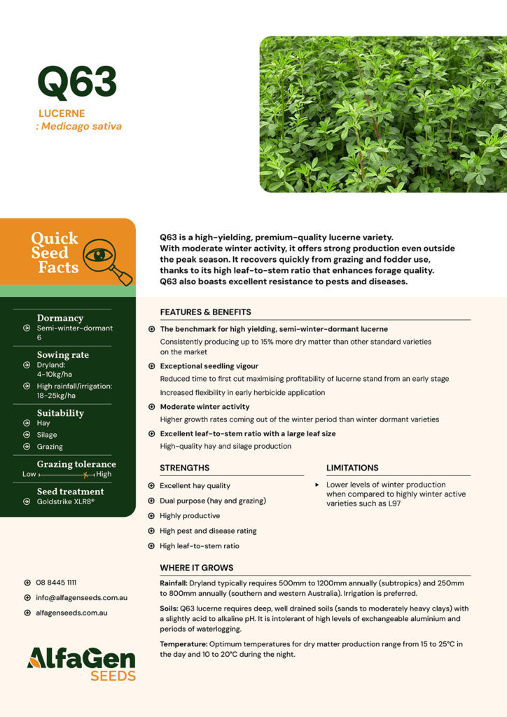 Q63 is a high-yielding, premium-quality lucerne variety. With moderate winter activity, it offers strong production even outside the peak season. It recovers quickly from grazing and fodder use, thanks to its high leaf-to-stem ratio that enhances forage quality. Q63 also boasts excellent resistance to pests and diseases.