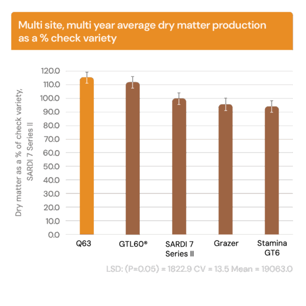 This graph displays the dry matter production from trials based at Keith in SA from 2022–2024. The forage data demonstrates an increase in forage production of Q63, of up to 15% over the life of the trials when compared with the check variety.